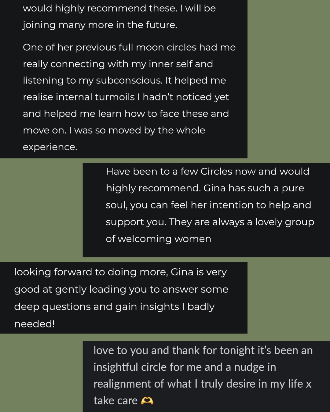 Risk-free: Show up to your first circle, if it doesn’t light you up, just let me know within 24 hours and I’ll refund you. No hard feelings.
